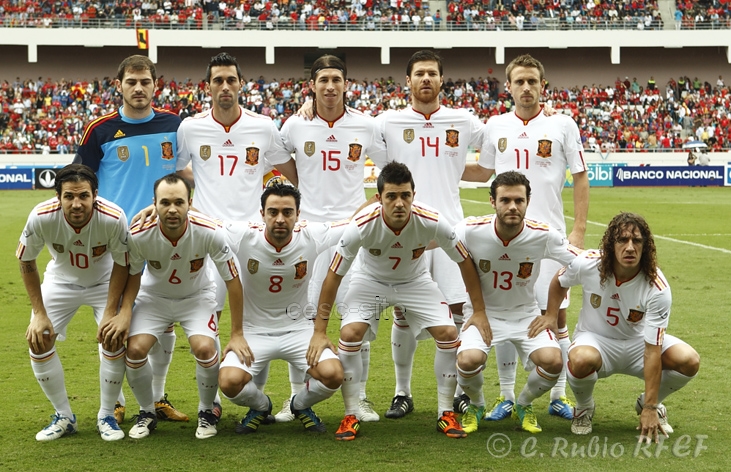 A spanyolok összeállítása Costa Rica ellen (San José, barátságos): Casillas (Valdés, 46.) - Arbeloa, Puyol, Ramos, Monreal (Torres, 70.) - Xavi (Cazorla, 46.), Xabi Alonso (Busquets, 46.), Iniesta - Mata (Navas, 46.), Fabregas (Silva, 65.), Villa